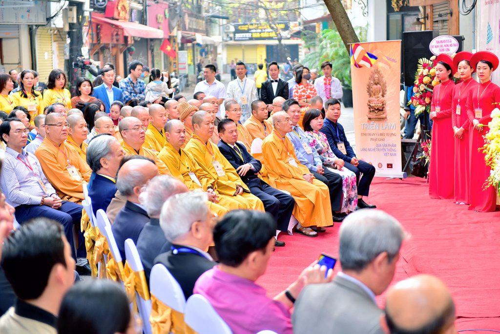 Phát biểu khai mạc Triển lãm, HT. Thích Hải Ấn – Phó Trưởng ban Văn hoá TƯ GHPGVN nhấn mạnh: “Trong khuôn khổ của Hội thảo khoa học – “Tinh thần và biểu tượng Phật giáo qua sản phẩm làng nghề truyền thống Việt Nam”, việc tổ chức Triển lãm để giới thiệu một phần thực tiễn ứng dụng, phát huy biểu tượng Phật giáo qua sản phẩm làng nghề truyền thống nhằm làm sâu sắc hơn nội dung, chủ đề Hội thảo là một việc làm hết sức cần thiết, hữu ích và có ý nghĩa. Triển lãm giới thiệu gần 50 tác phẩm của một số nghệ nhân từ các làng nghề như: Bát Tràng, Ngũ Xã, Hạ Thái – Duyên Thái… Mặc dù số lượng sản phẩm làng nghề tham gia Triển lãm lần này không nhiều nhưng đều là những sản phẩm tiêu biểu,và mang những thông điệp rất ý nghĩa bởi đó đều là các sản phẩm chứa đựng tâm huyết của những nghệ nhân “tâm sáng – tài cao” từ các làng nghề bao đời “giữ lấy tinh hoa”. Các sản phẩm được giới thiệu trong Triển lãm là kết quả của sự góp công, góp sức của nhiều người – từ những chư Tôn đức, quý Hoà thượng, Thượng toạ, Đại đức, Tăng ni Phật tử tới nhà thư pháp cao niên, những trí thức trẻ”…